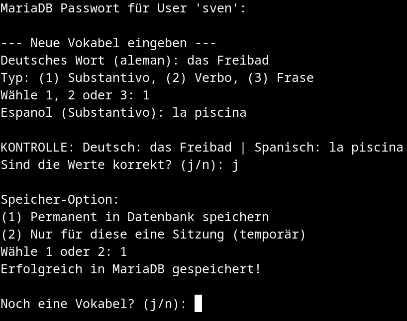 temporaere_vokabeln.append({"de": aleman, "es": spanisch_wert})