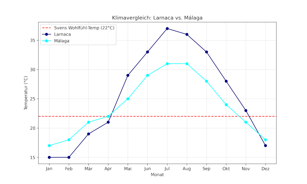 Larnaca auf Zypern ist ebenfalls ein Kandidat, doch wie mein Diagramm zeigt, schlägt dort im Sommer die Hitze mit über 35 Grad zu – ein Preis, den man für die Wärme im Winter zahlt.