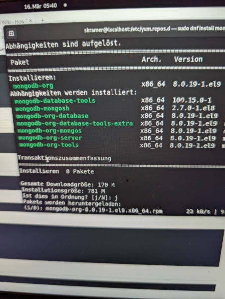 Viele Anleitungen setzen noch den Zusatzbefehl y bei sudo dnf install y mongodb-org hin, was eine automatische Installation bedeutet. Ich mache das nur selten, weil ich schon gerne schauen möchte, was da installiert wird, denn schließlich kann ich mich noch spontan umentscheiden, wenn ich es doch nicht möchte oder feststelle, dass die Installationsdateien doch zu alt sind. Kann ja auch mal sein.